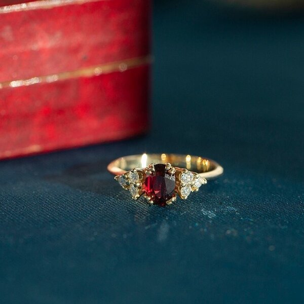 | Stone type: | Garnet 7 x 5 mm and 6x 0.035 ct. brilliant cut G-SI |