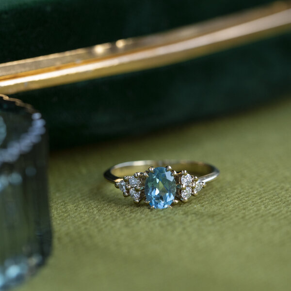 | Stone type: | Swiss Topaz 7 x 5 mm and Diamond 6x 0.035 ct. brilliant-cut G-SI |