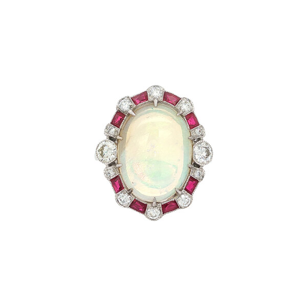 | Stone type: | Opal 14.5 x 10 mm, Ruby 8x 2 x 3 mm and Diamond 0.58 ctw. (12x) |