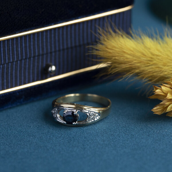 | Stone type: | Sapphire 5x 4.1 mm and Diamond 6x 0.01 ct. 8-cut H-P |