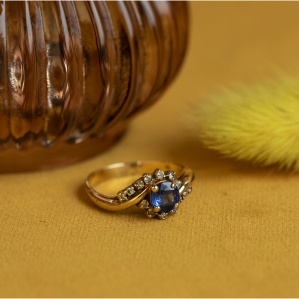 Stone type: | Natural sapphire 5.8 x 5.4 mm and Diamond 14x 0.02 ct. RBG G/SI |