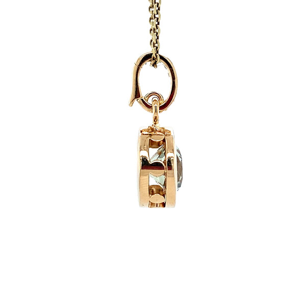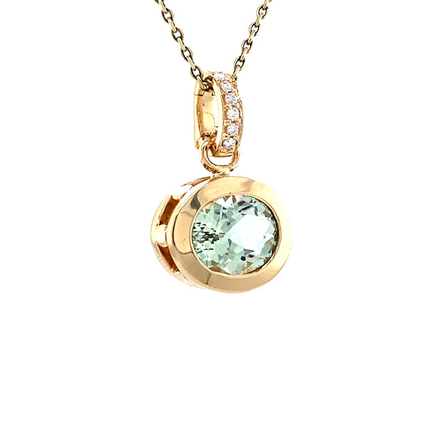| Stone type: | Prasiolite (green quartz) 8.2 x 9.8 mm and Diamond 6x 0.01 ct. RBC G/VVS |