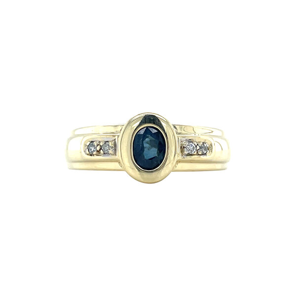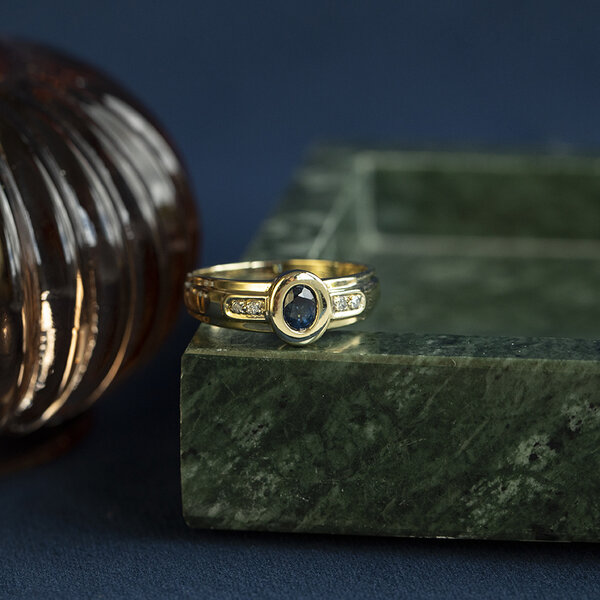 | Stone type: | Synthetic sapphire 5.1 x 3.6 mm and Diamond 4x 0.01 ct. octagon-cut G/SI |