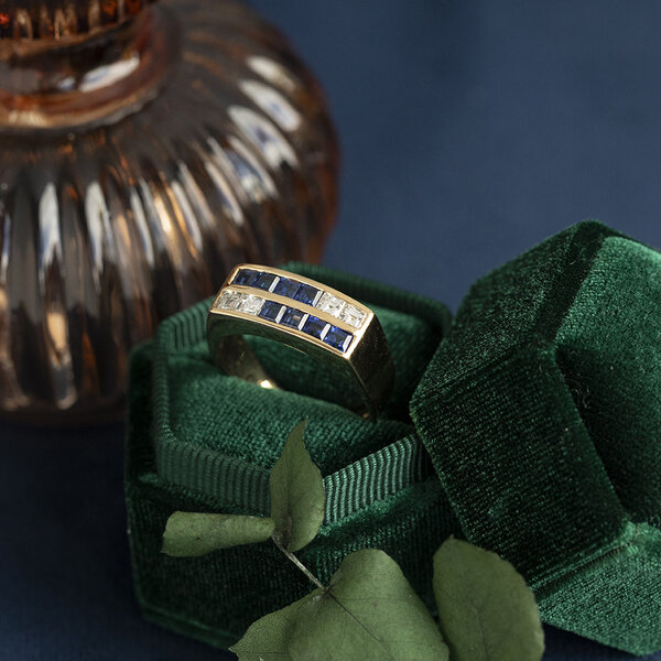 | Stone type: | Natural sapphire 8x 2.6 x 3.2 mm and Diamond 4x 0.15 ct. F/VS (0.60 ctw.) |