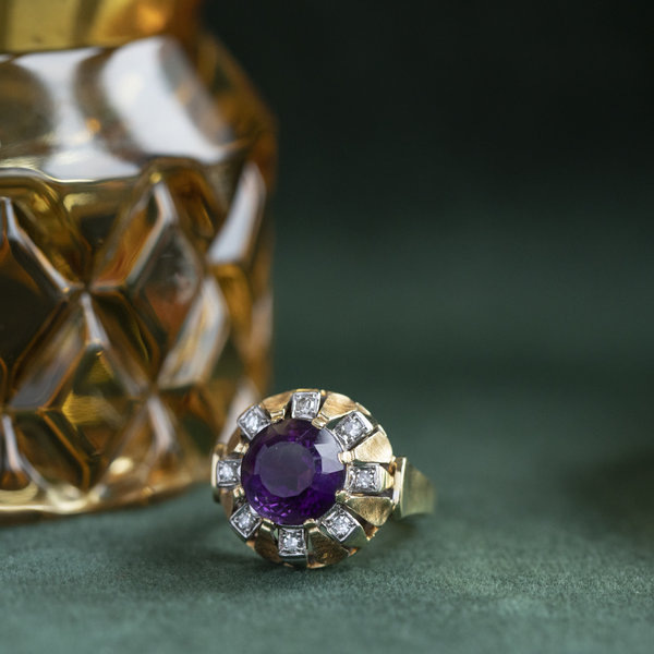 Gold ring with amethyst and diamond 14 crt
