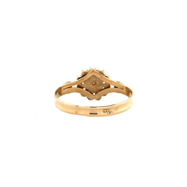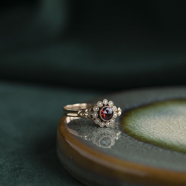Gold ring with glass garnet and pearl 14 krt