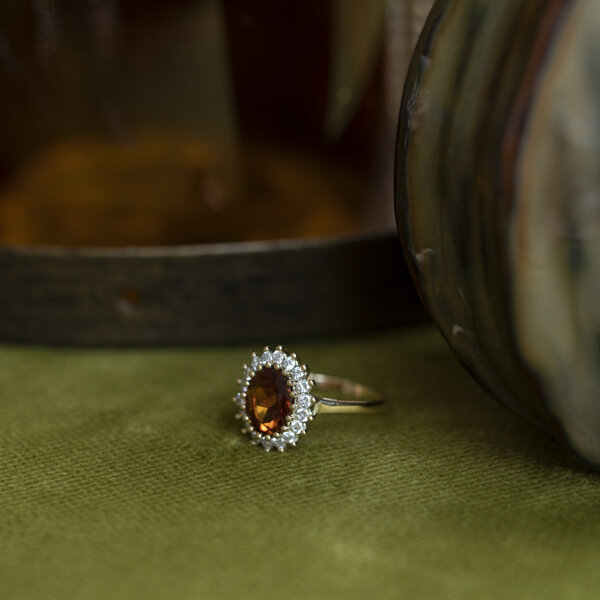 Stone type: Madeira Citrine 9 x 7 mm and Diamond 18x 0.02 ct. G-SI