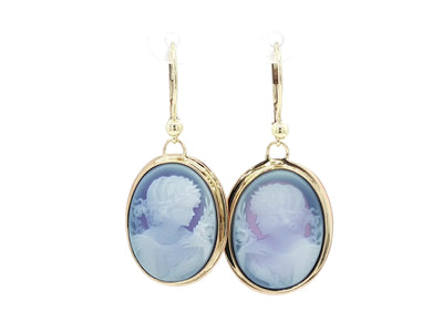 Yellow gold earrings set with a blue cameo in a bezel setting.