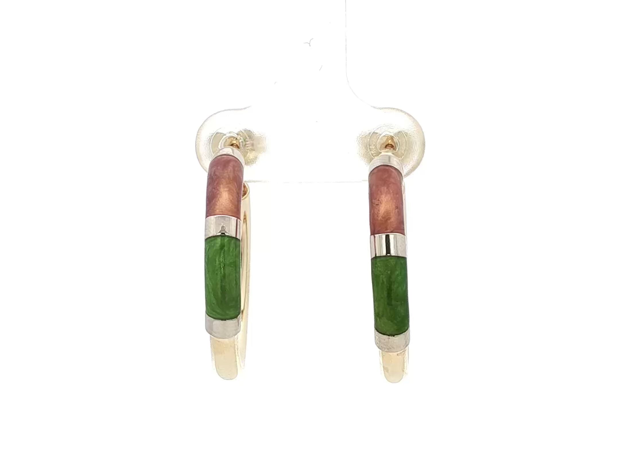 Yellow gold stud earrings set with green and brown enamel.