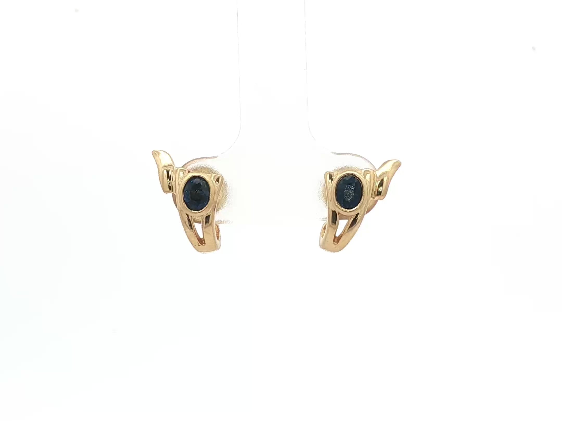 Yellow gold stud earrings set with facet cut natural sapphire in a rub-over setting.