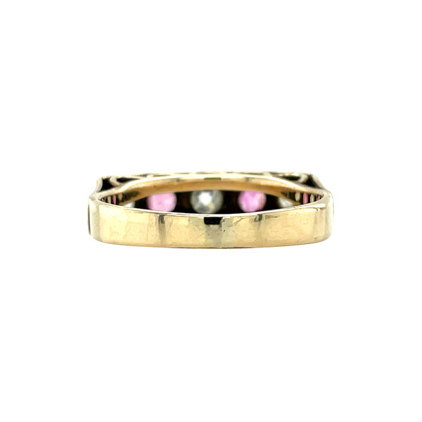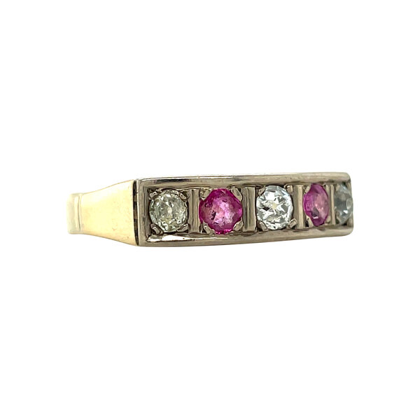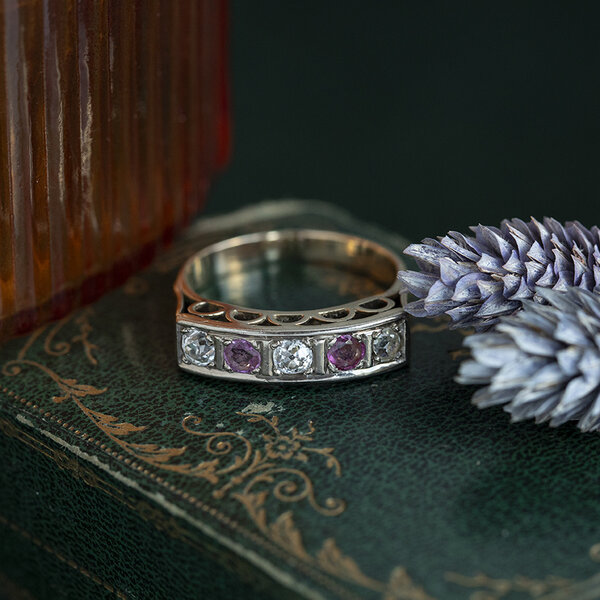 | Stone type: | Natural ruby 2x 3.8 mm and Diamond 2x 0.14 ct. old euro cut M/SI and 1x 0.15 ct. old euro cut J/SI (0.43 ctw.) |