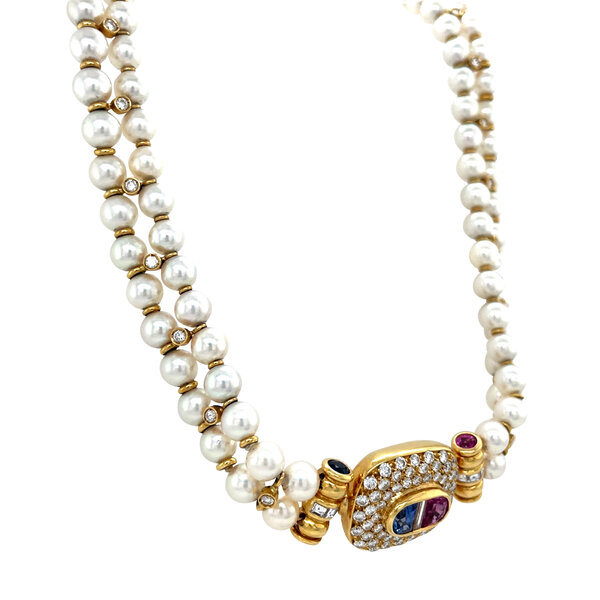 | Stone type: | Natural pink and blue sapphire 5.5 x 4.2 mm and 2x 4 mm, Pearl 5.5 mm and Diamond 28x 0.02 ct., 20x 0.015 ct., 20x 0.02 ct., 20x 0.025 ct. G/SI RBC, 1x 0.18 ct. L?SI baguette cut and 6x 0.05 ct. G/SI square step cut (2.24 ctw.) |