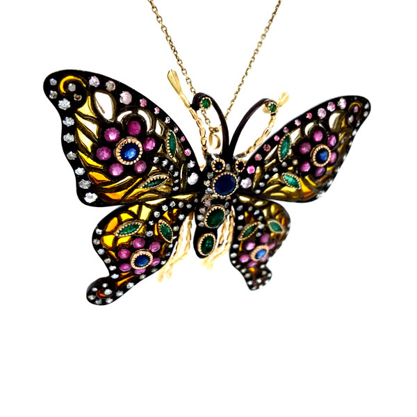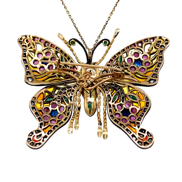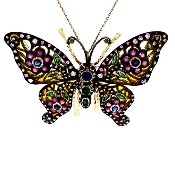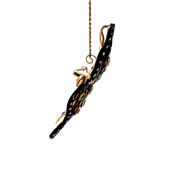 Steensoort: | Natuurlijke saffier 1x 5 mm, 4x 3.8 mm en 2x 1.8 mm, Smaragd 1x 5.2 x 4 mm, 1x 5 x 3.4 mm, 8x 5.8 x 2 mm en 2x 1.8 mm, Robijn 24x 3 mm, Plique-à-jour emaille, Diamant 0.27 ctw. 8-kant, 0,265 ctw. oud Europees, 1,415 ctw. rond briljant en 1x 1.27 mm roos |
