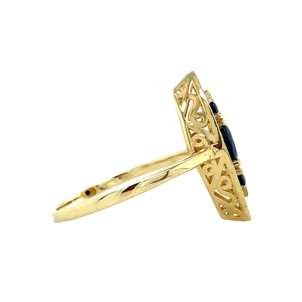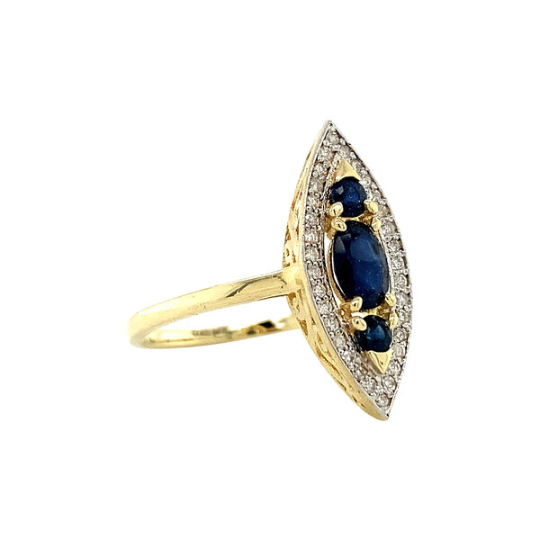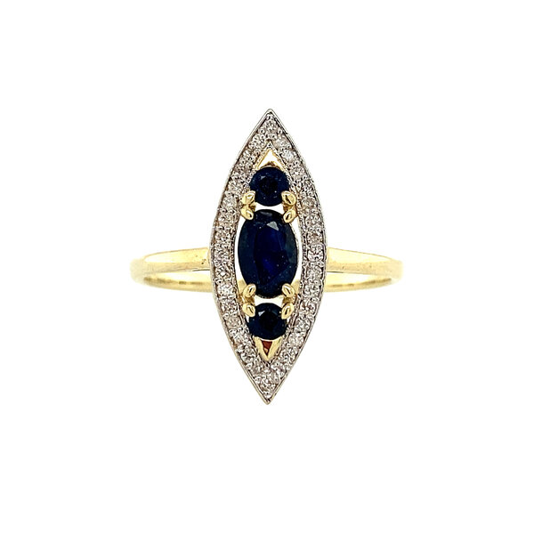 | Steensoort: | Natuurlijke saffier 1x 5.5 x 3.8 mm en 2x 2.5 mm en diamant 0.16 Hsi |
