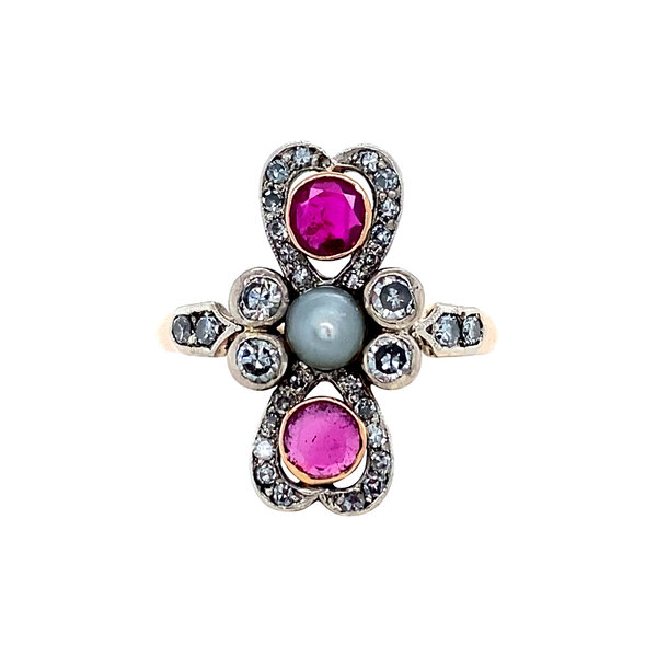 Steensoort: | Natuurlijke robijn 2x 4.2 mm, Parel 4.5 mm en Diamant 4x 0.06 ct., 2x 0.025 ct. en 2x 0.035 ct. overgangsgeslepen G/VS en 10x 0.01 ct. en 14x 0.005 ct. 8kant geslepen G/SI |