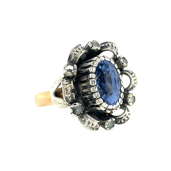 | Steensoort: | Natuurlijke saffier 10 x 6 mm en Roosdiamant 6x 1.75 mm |