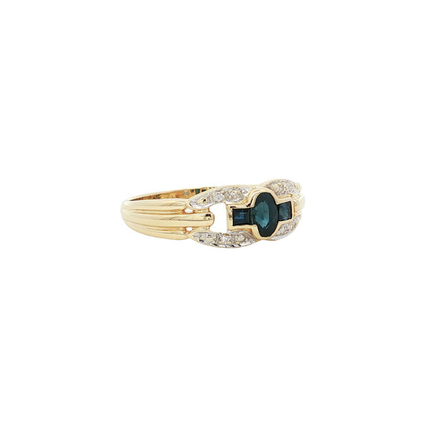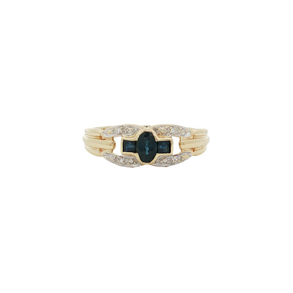 | Steensoort: | Natuurlijke saffier 1x 4.8 x 3.4 mm en 2x 1.5 x 2 mm en Diamant 4x 0.005 ct. G/SI 8kant geslepen (0.02 ctw.) |