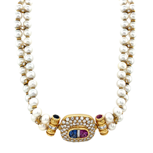 Steensoort: | Natuurlijke roze en blauwe saffier 5.5 x 4.2 mm en 2x 4 mm, Parel 5.5 mm en Diamant 28x 0.02 ct., 20x 0.015 ct., 20x 0.02 ct., 20x 0.025 ct. G/SI RBC, 1x 0.18 ct. L?SI baguette geslepen en 6x 0.05 ct. G/SI square step geslepen (2.24 ctw.) |