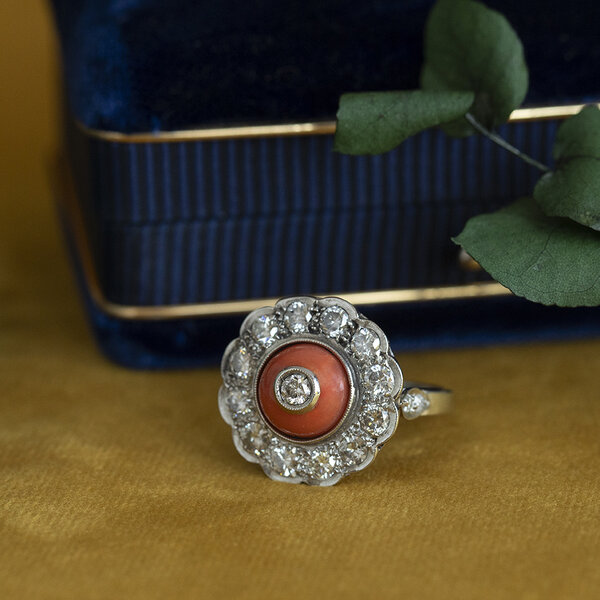 | Steensoort: | Bloedkoraal 8.5 mm en Diamant 1x 0.10 ct., 12x 0.08 ct. en 4x 0.02 ct. J-K SI2 (1.14 ctw.) |