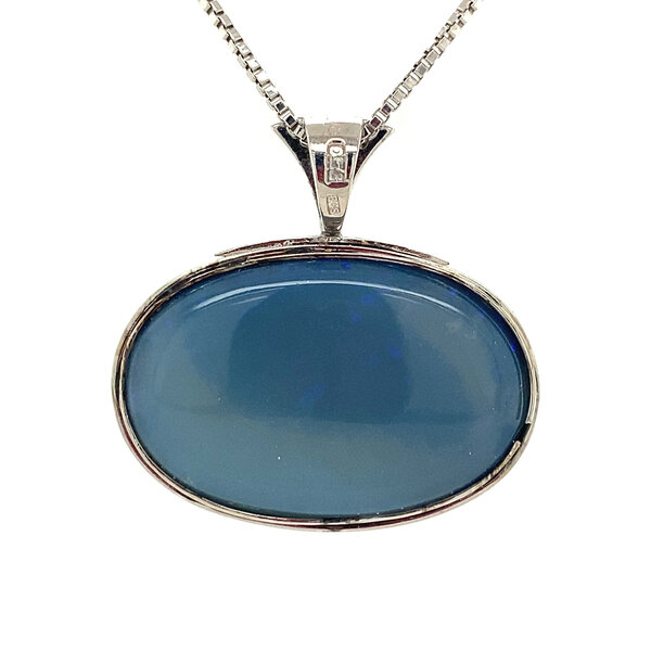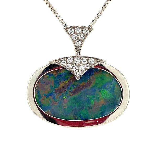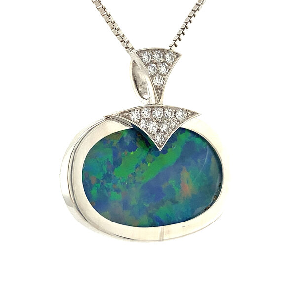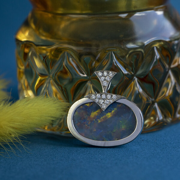 Steensoort: | Opaal doublet 26 x 17 mm en Diamant 14x 0.03 ct. en 2x 0.015 ct. briljant geslepen G-SI |