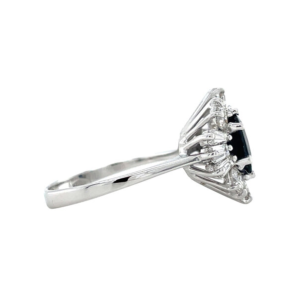 | Steensoort: | Natuurlijke saffier 7.8 x 6.5 mm en Diamant 6x 0.13 ct. rond F/VS en 6x 0.07 ct. marquise F/VS (1.2 ctw.) |