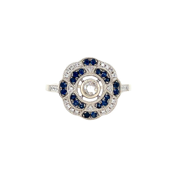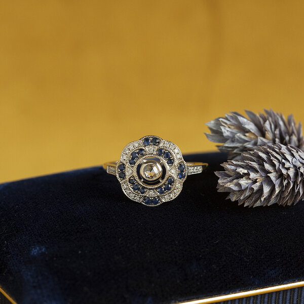Steensoort: | Natuurlijke saffier 20x 1.4 mm, Roosdiamant 2.75 x 2.75 mm G/SI en Diamant 28x 0.0025 ct. G/VS briljant geslepen (0.07 ctw.) |