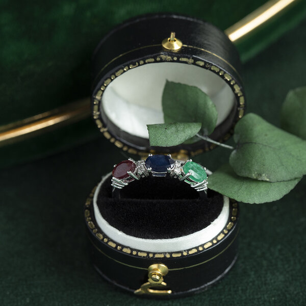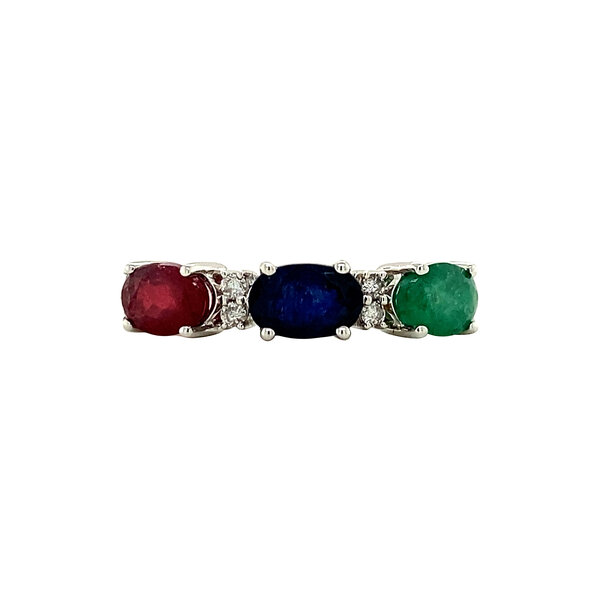 | Steensoort: | Smaragd 4.1 x 6 mm, Saffier 4.1 x 6 mm, Robijn 4.1 x 6 mm en Diamant 8x 0.01 ct. H/SI2 |