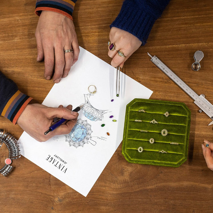 Custom made betekent dat we samen een uniek sieraad ontwerpen, volledig afgestemd op jouw wensen. Dat kan een verlovingsring zijn, een herontwerp van een erfstuk of een volledig nieuw ontwerp geïnspireerd op vintage stijlen.