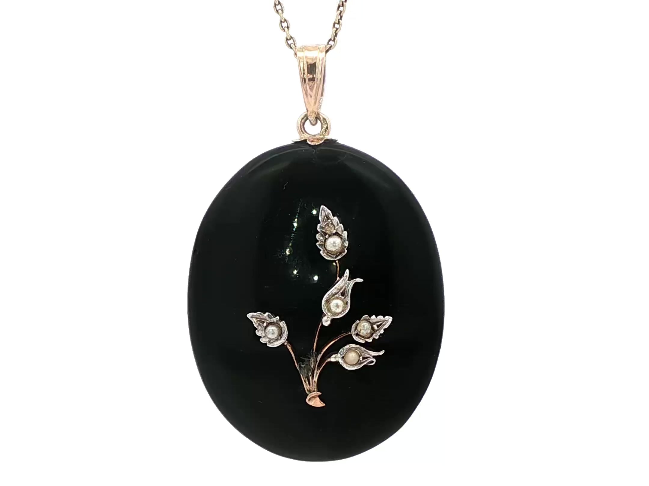 Prachtige hanger bezet met onyx en parels aan de voorzijde. De achterzijde bevat een glazen medaillon waar je een foto in kan dragen.